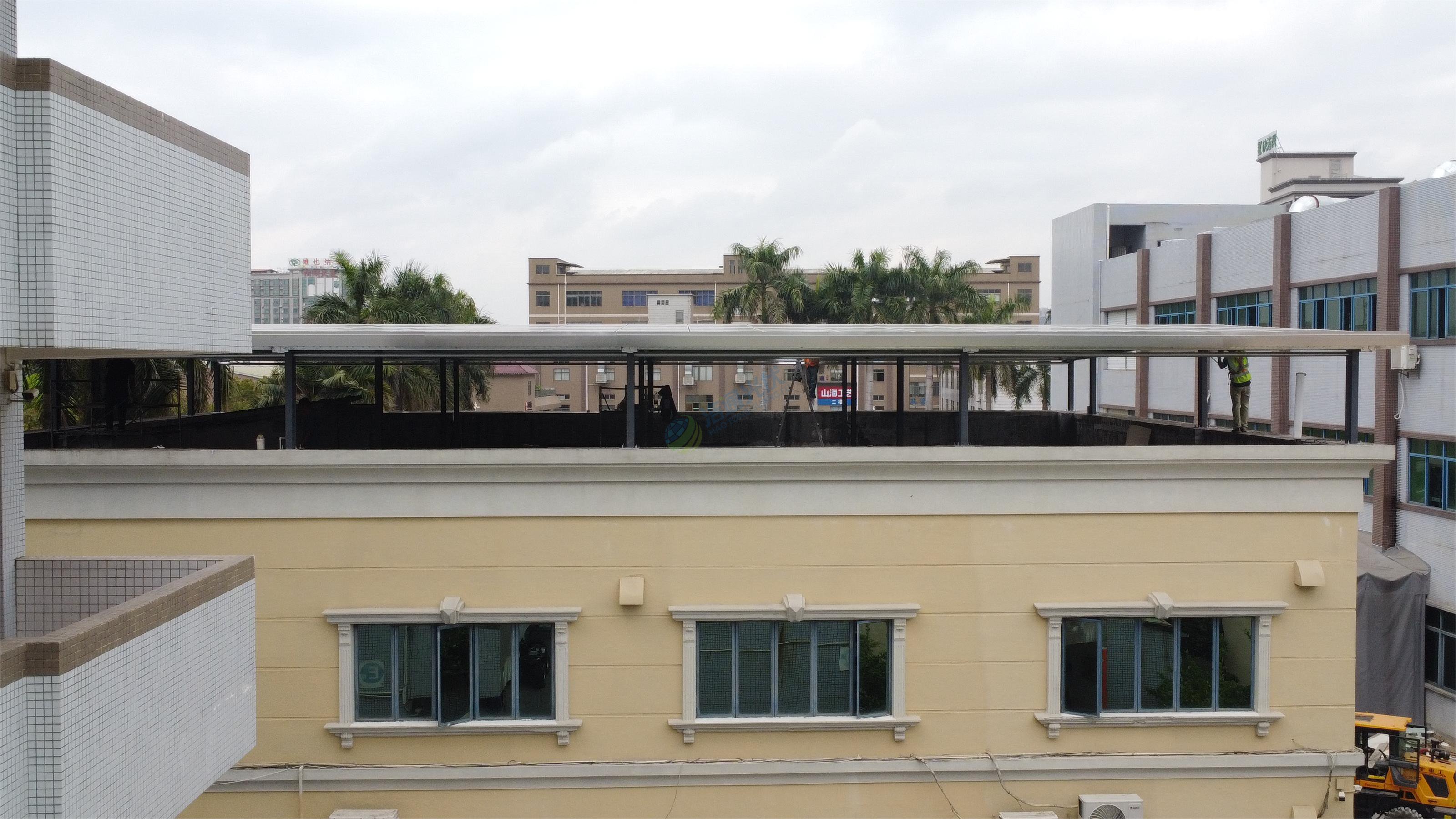 該項目位于東莞寮步,采用132塊555W晶科光伏板,200mmH鋼支架,所有立柱立于業主現有水泥柱上,整體結構穩定牢固。